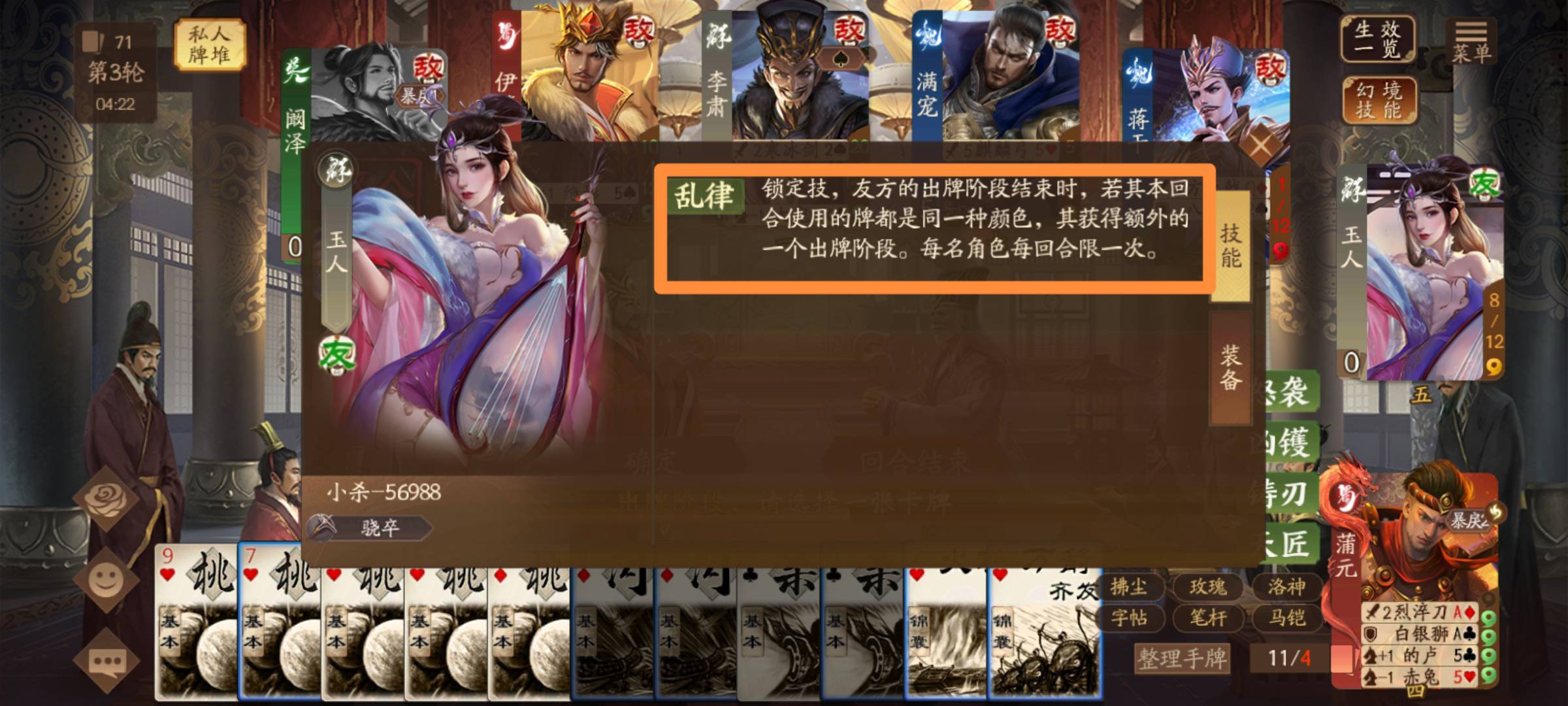 即使“乱律”多了一个额外的出牌阶段,但该回合仍然只能发动两次弃牌加伤,但额外出一张杀却会生效两次,该回合总共可以出四张杀。